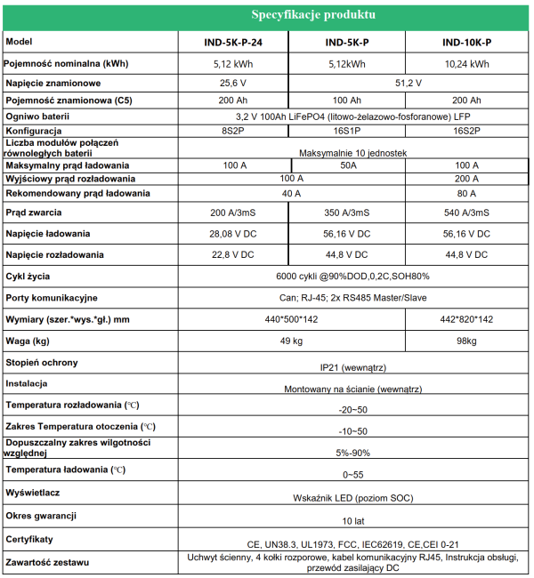 - Bogata gama akcesoriów: W zestawie akcesoriów znajdują się: tablica montażowa do zawieszania akumulatora na ścianie, kabel połączeniowy do falownika hybrydowego oraz opcjonalny kabel równoległy do łączenia modułów. Baterie litowe IND-5K-P-24 , 25,6V, przeznaczone do magazynowania energii słonecznej, gwarantują niezawodne i bezpieczne przechowywanie energii.